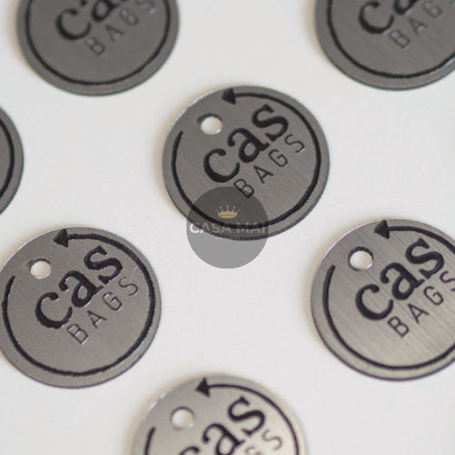 Dale un acabado profesional y elegante a tus productos con nuestras etiquetas o dijes en símil metal plateado, totalmente personalizadas con tu logo, nombre o frase. Ideales para prendas, accesorios, bolsos, calzado, tejidos y mucho más.